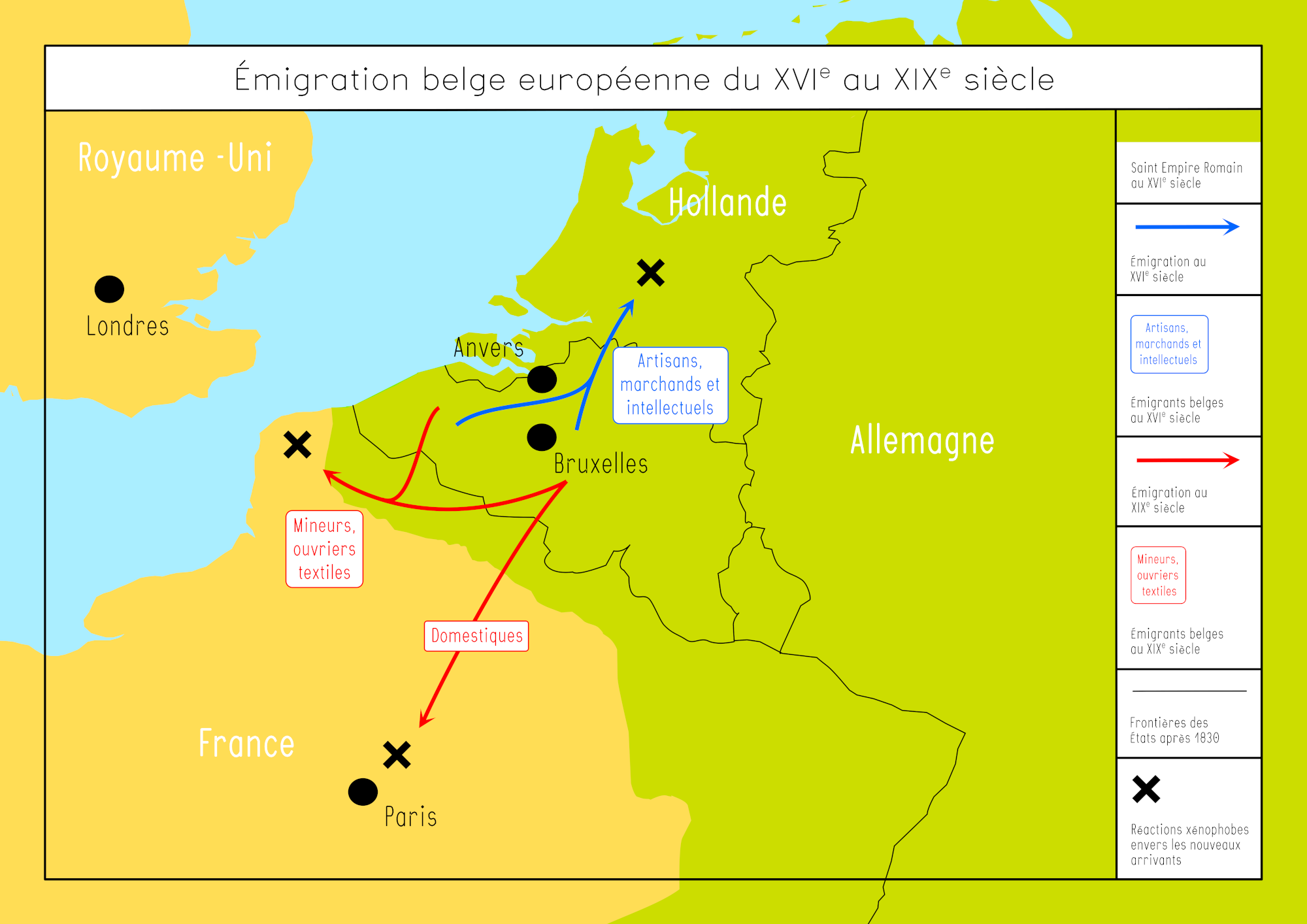Au XIXe siècle, c’est en France que les Belges sont les plus nombreux à émigrer, notamment dans le Nord. À partir de 1850, les Belges représentent même la plus grosse communauté étrangère. Tandis que beaucoup iront travailler dans l’industrie du textile ou du charbon dans le Nord, nombre de femmes belges seront employées à Paris comme domestiques. Même s’ils sont appréciés pour la qualité de leur travail et le fait qu’ils acceptent un salaire inférieur à celui de leurs camarades français, ils font également face à de nombreux préjugés. Les réactions anti-belges qui accompagnent les difficultés économiques et la hausse du chômage touchent tous les Belges vivant en France mais surtout les néerlandophones. En 1901, 323.390 Belges vivaient en France dont près de 200.000 uniquement dans le département du Nord.