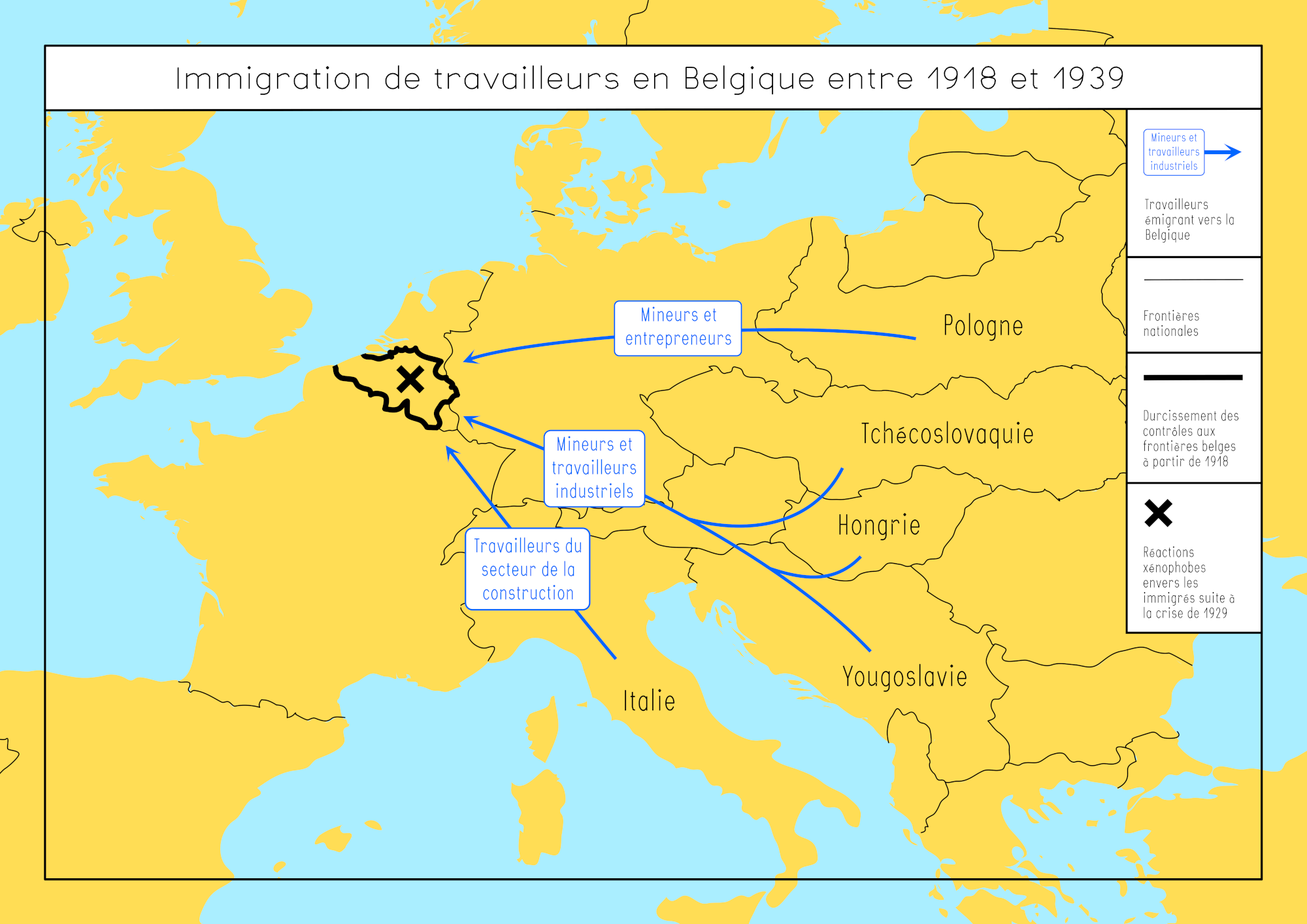 Alors que la Belgique, à l’instar d’autres pays européens était majoritairement un pays d’émigration, la situation s’inverse à la sortie de la Première Guerre mondiale. Dès 1918, toutes les personnes étrangères sont contrôlées à la frontière et se voient demander un passeport et un visa belge afin d’entrer sur le territoire, entravant ainsi la libre circulation des personnes.